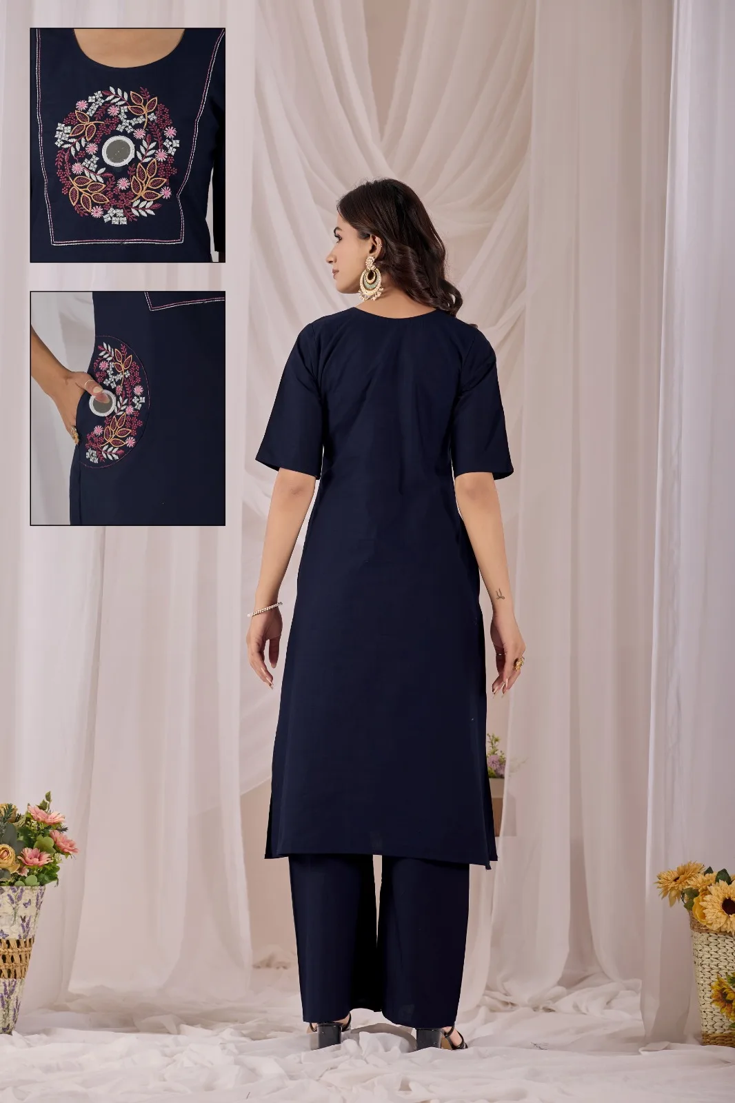 Elevate your ethnic style with this Silk Blend kurta set, featuring intricate floral embroidery . Designed with a flattering V-neckline, three-quarter sleeves, and a straight cut, this 44-inch kurta pairs beautifully with matching slim-fit pants and a flowing dupatta for a graceful, festive-ready look. Perfect for weddings, parties, and special occasions, this outfit blends elegance with comfort.
