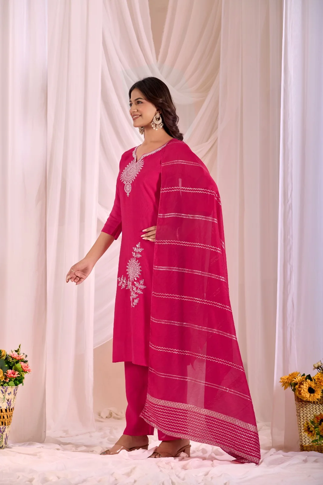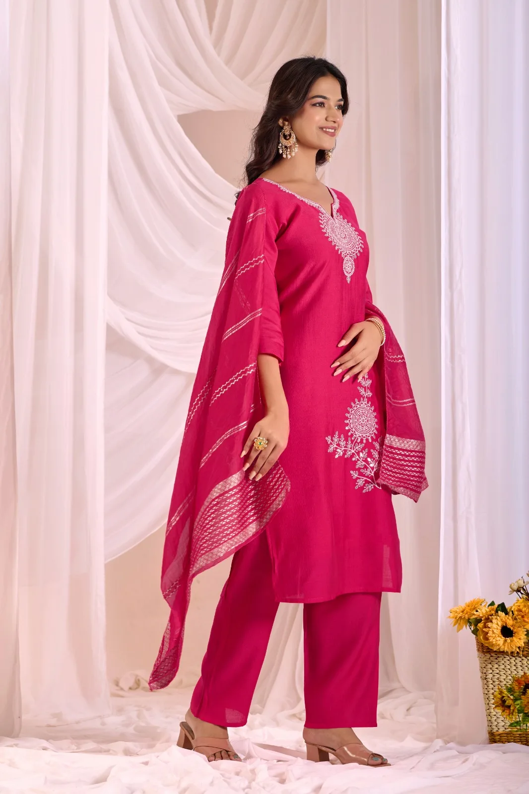 Elevate your ethnic style with this Silk Blend kurta set, featuring intricate floral embroidery . Designed with a flattering V-neckline, three-quarter sleeves, and a straight cut, this 44-inch kurta pairs beautifully with matching slim-fit pants and a flowing dupatta for a graceful, festive-ready look. Perfect for weddings, parties, and special occasions, this outfit blends elegance with comfort.